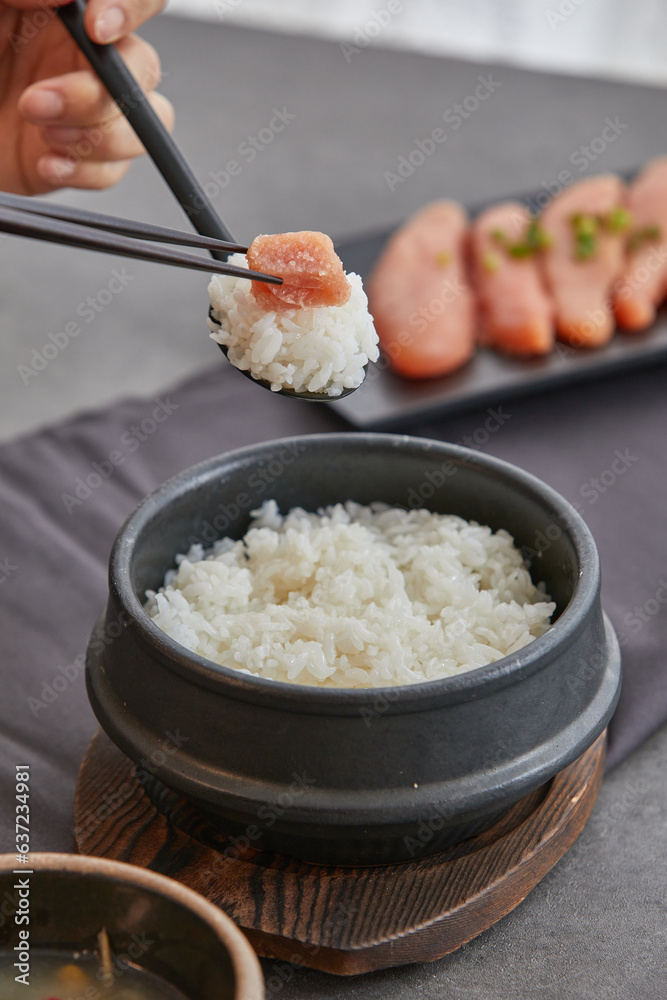 맛있게 지어진 흰쌀밥 한숟가락위에 명란젓을 한조각 얹어놓은 모습