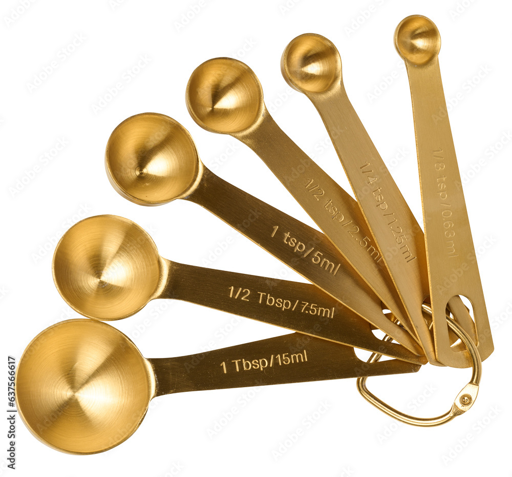 Golden metal measuring spoons for bulk and liquid products on a white isolated background, top view