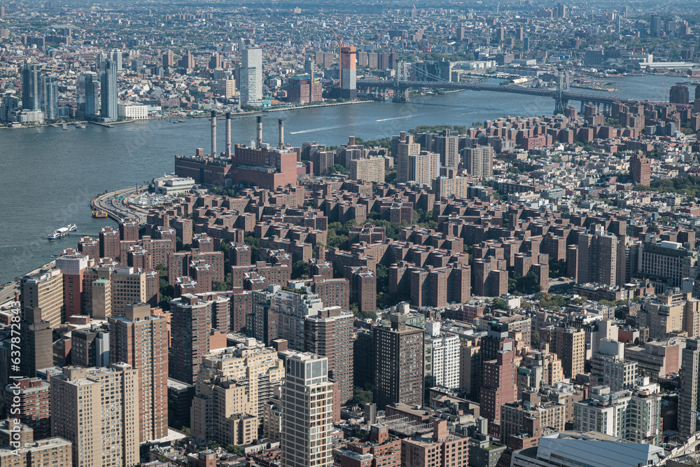 East Harlem (Spanish Harlem or El Barrio) neighborhood of Upper Manhattan, East river, aerial view, East Side, New York, USA