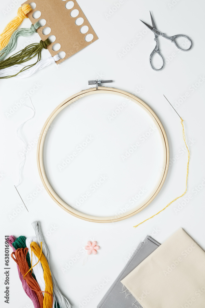 Embroidery set fot stitching. Beige cotton cloth in embroidery hoop on white background with fabric, colorful threads, scissors and needls. Indoor hobby concept with copy space, top view