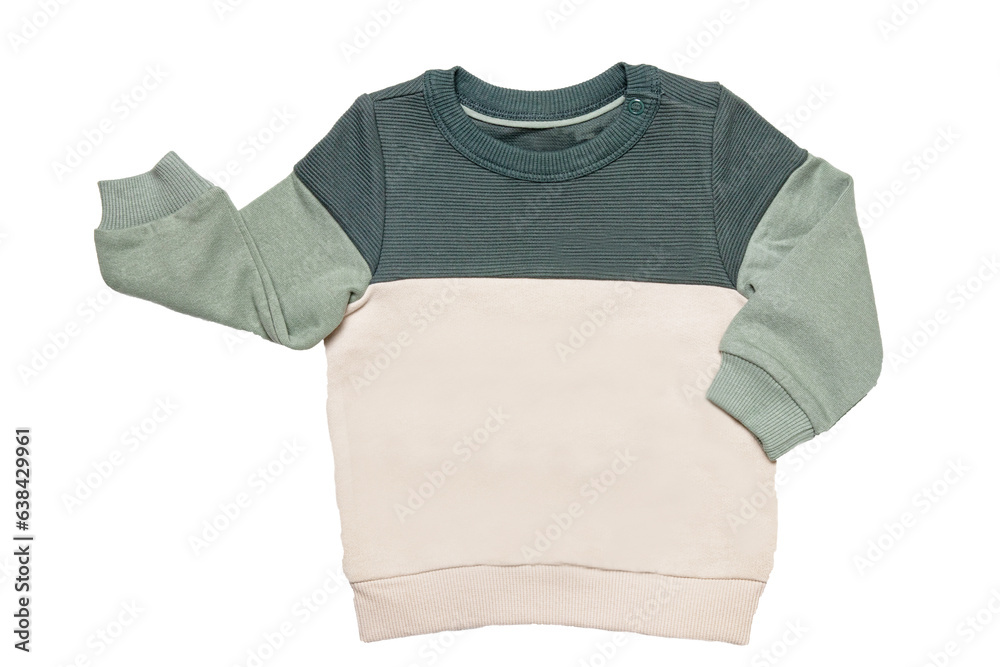 Autumn and winter children clothes. A green beige cozy warm sweater or pullover isolated on a white background. Spring fashion for child boy. Back view.