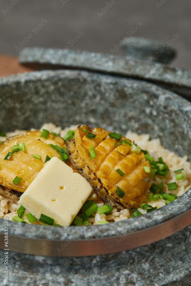 솥안에 맛있게 지어진 전복 버터 솥밥에 버터를 얹어 놓은 모습