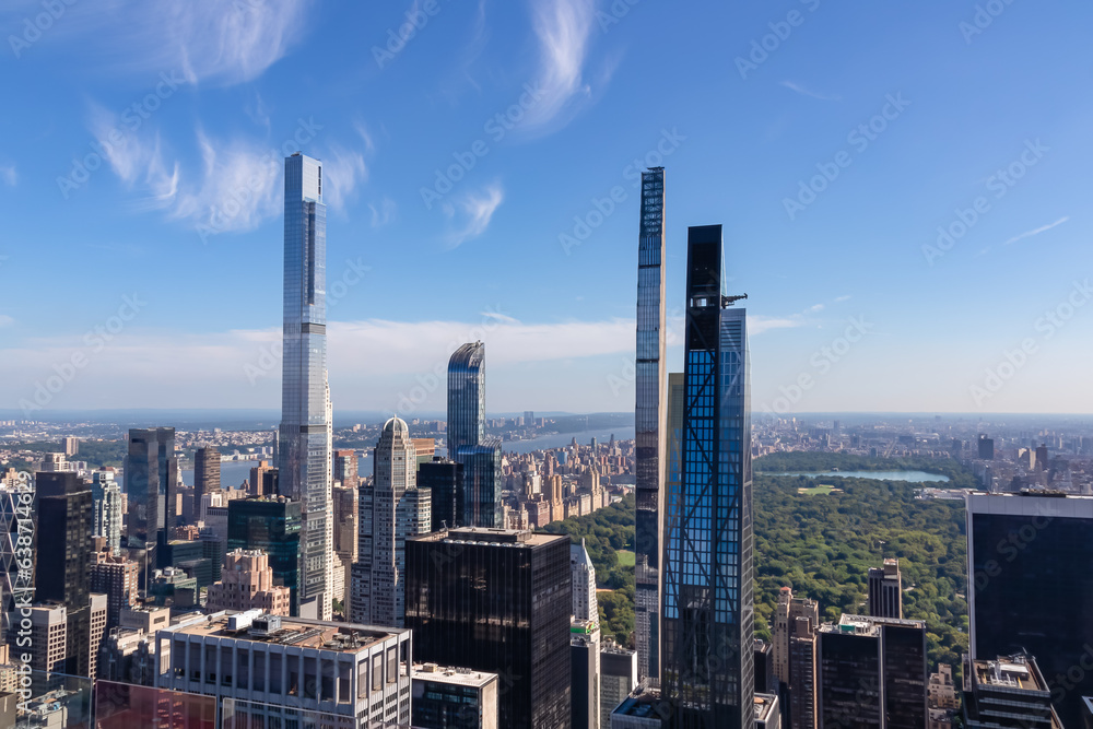 Vibrant urban skyline with towering skyscrapers and impressive architecture seen from Top of The Rock in New York. View on the Central Park from above. Hudson river on the side. Modern and lively city