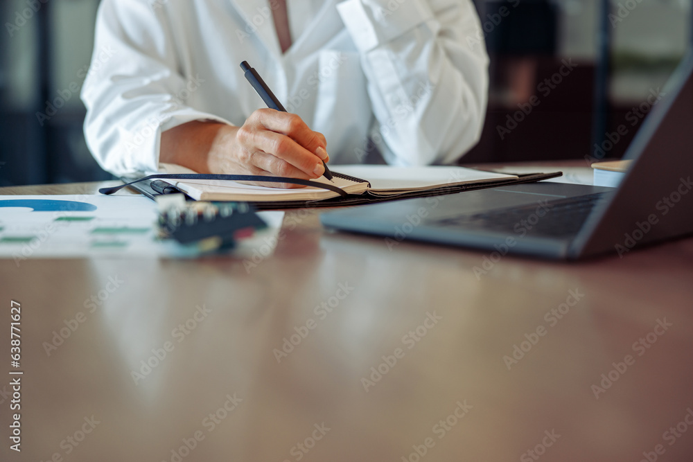 Close up of business woman working on laptop, making notes in modern office interior