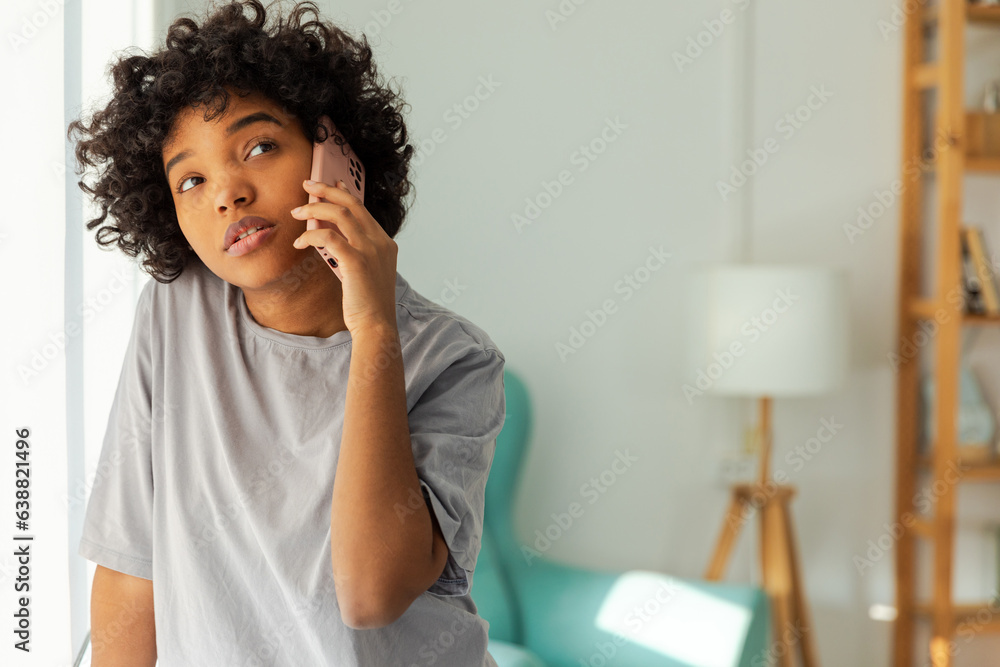 African american girl talking on smartphone at home indoor. Young woman with cell phone chatting with friends. Smiling teen girl making answering call by cellphone. Lady having conversation by mobile