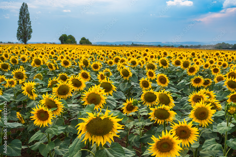 View of a field with sunflowers in full bloom in Rheinhessen/Germany