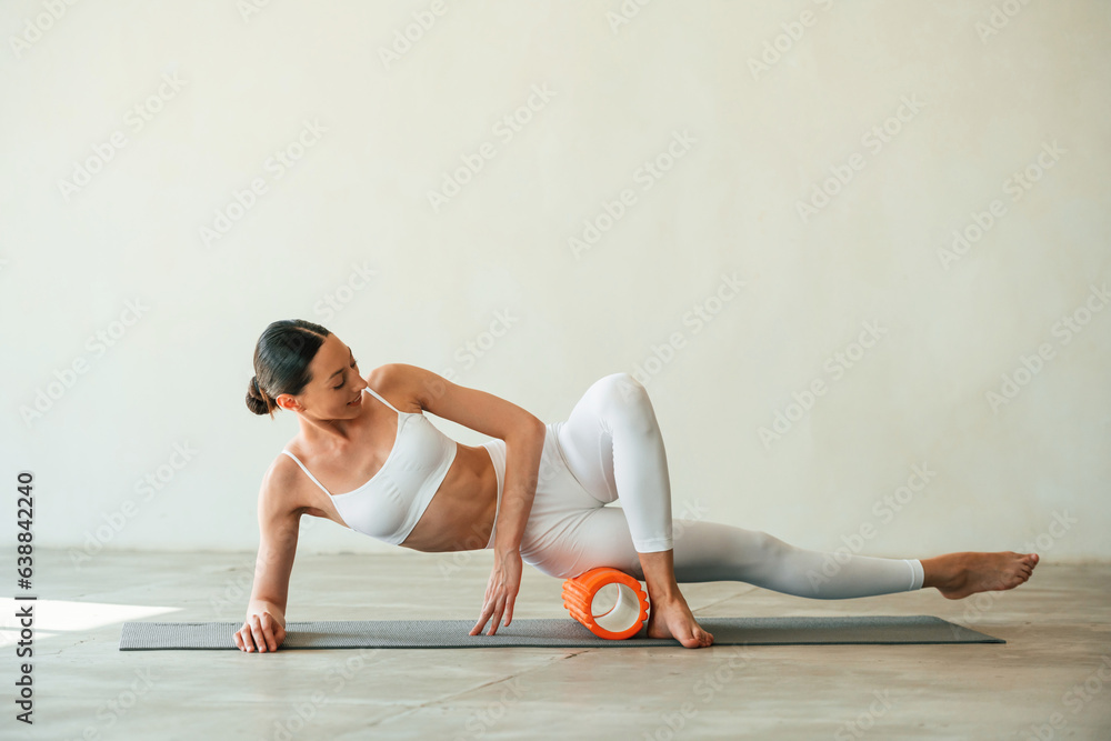 Using foam roller for exercises. Young woman with slim body type is in fitness clothes in the studio