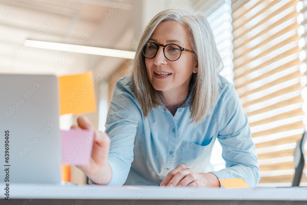 Portrait of smiling confident senior woman wearing stylish eyeglasses using laptop planning project. Attractive businesswoman working in modern office using sticky notes, scrum. Successful business