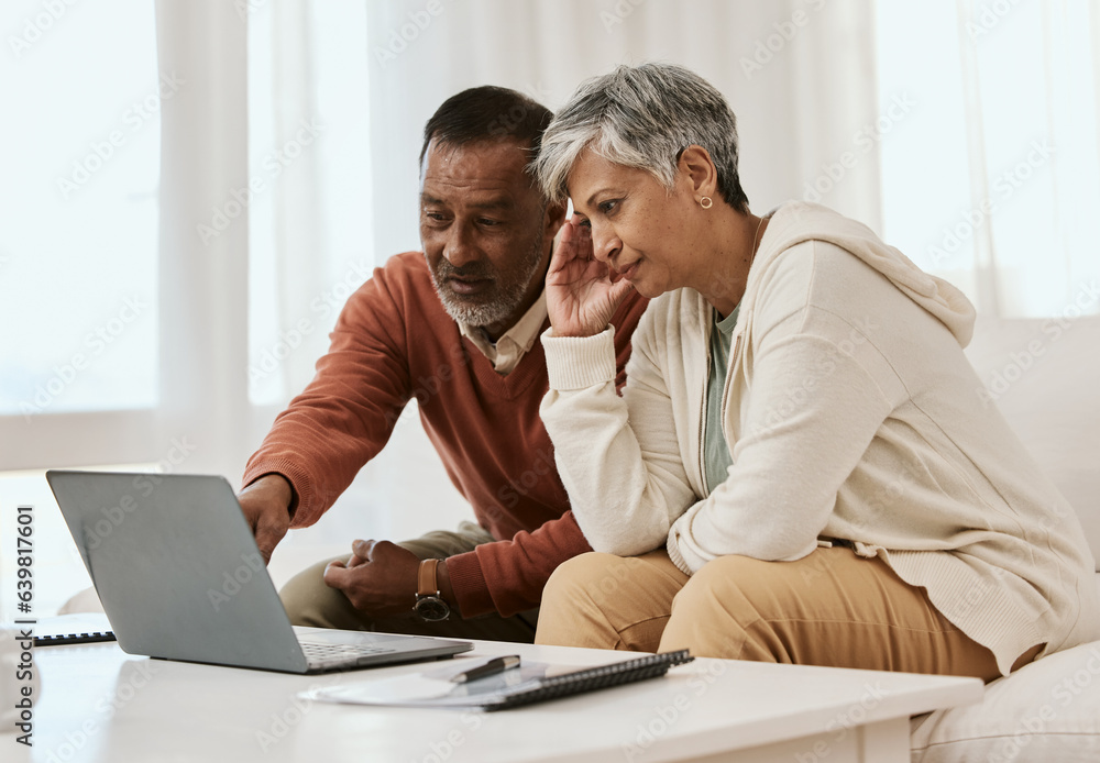 Frustrated senior couple, laptop and financial crisis in debt, mistake or discussion on expenses or bills at home. Mature man and woman in finance, struggle or stress in budget planning on computer