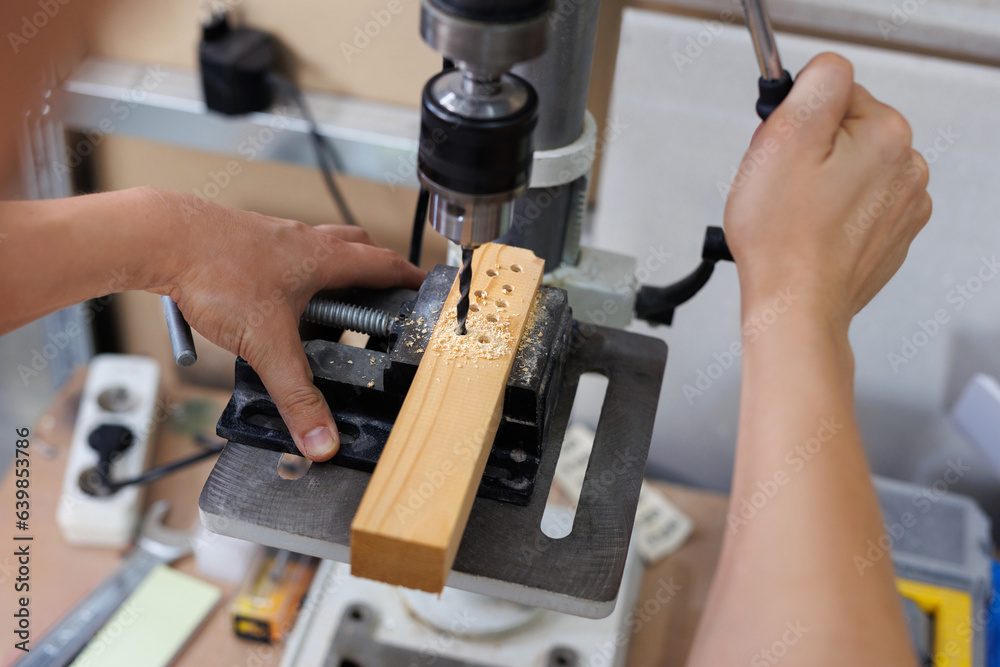A carpenter's drill makes a hole in a wooden board. Automatic carpentry machine