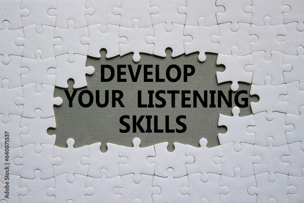 Listening skills symbol. Concept word Develop active listening skills on white puzzle. Beautiful grey background. Business and Develop active listening skills concept. Copy space