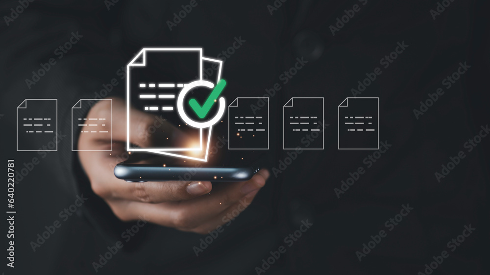 Performance checklist, Checklist survey for evaluation concept. Filling out digital form checklist, take an assessment. Digital document work, paperless, online survey. tick mark up on check boxes.