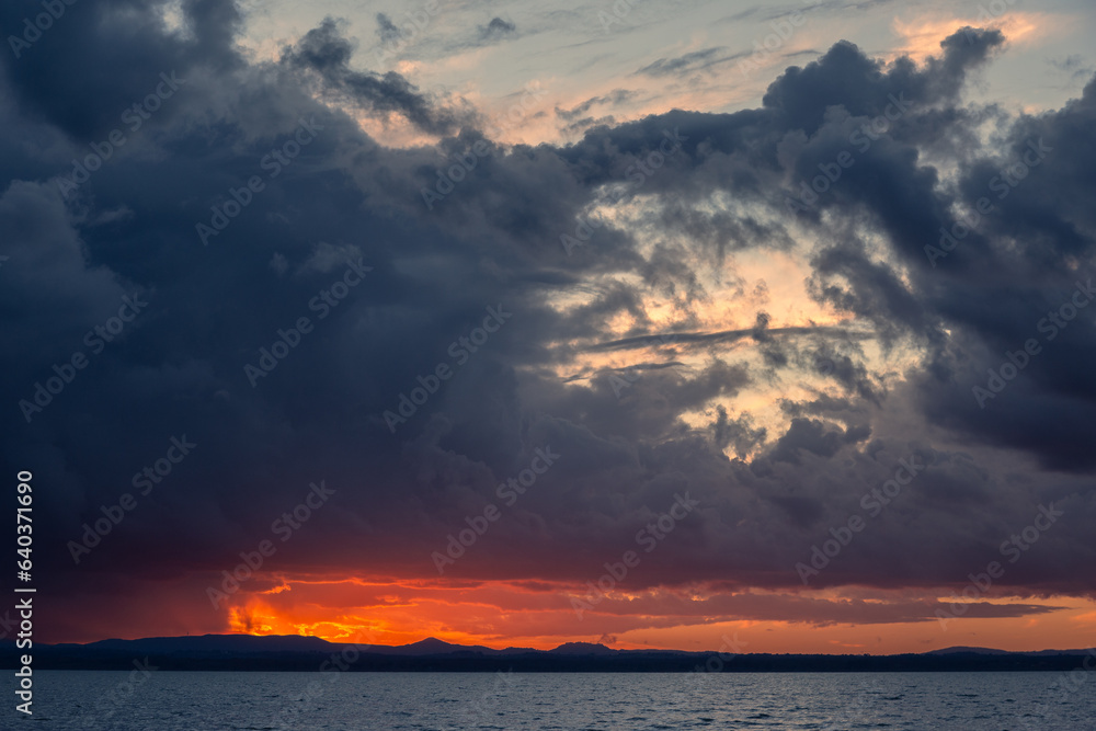 Spectacular sunset above a lake in the middle of heavy, moody clouds
