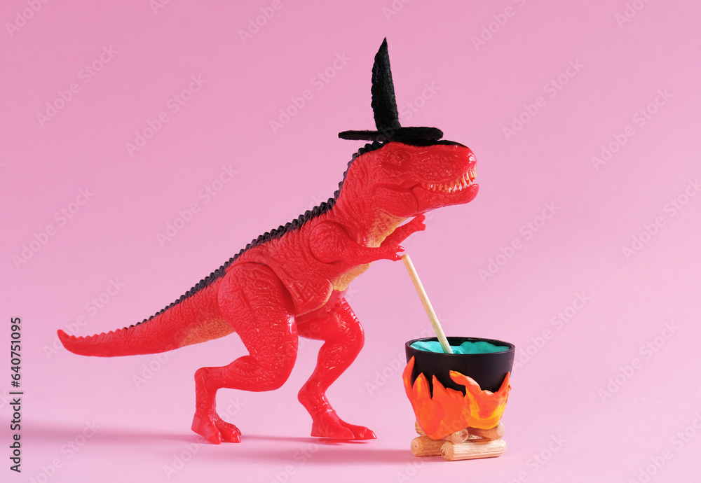 Red dinosaur wearing witch hat is brewing potion in pot on pink background. Halloween greeting card.