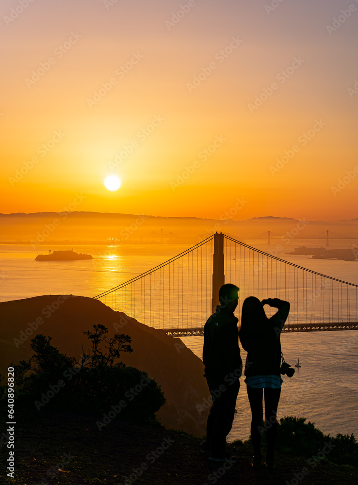 People enjoying the sunrise landscape of the Golden Gate Bridge
