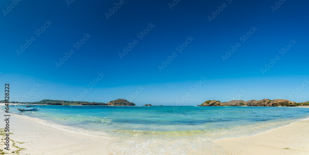Lombok, Indonesia, Beach ocean panoramic view landscape at Tanjung Ann beach area. Lombok is an island in West Nusa Tenggara province, Indonesia.