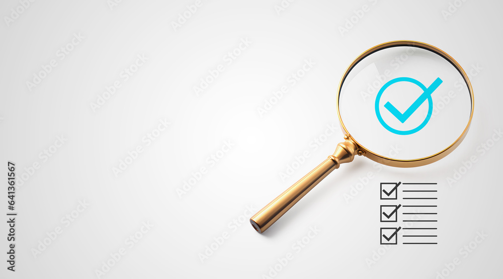 Inventory of quality standards and quality assurance improvements. Standardization, certification. Compliance with regulatory services and standards.magnifying glass on the paper