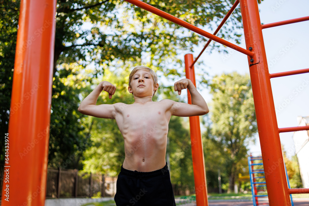 A teenager boy of an athletic build shows his muscles. Street workout on a horizontal bar in the school park.