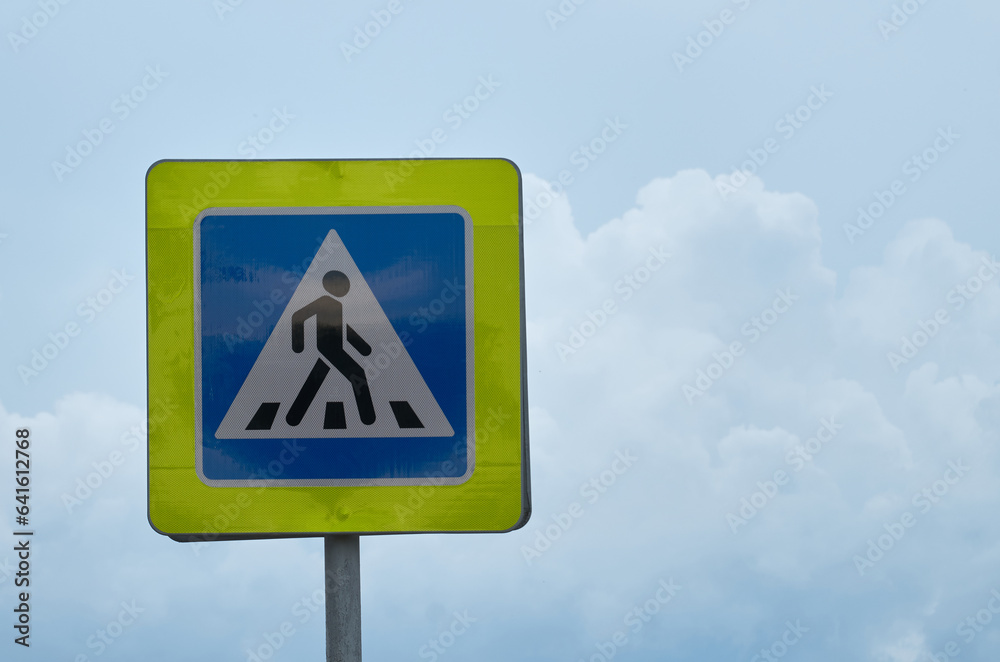 Road sign "pedestrian crossing" against a cloudy sky