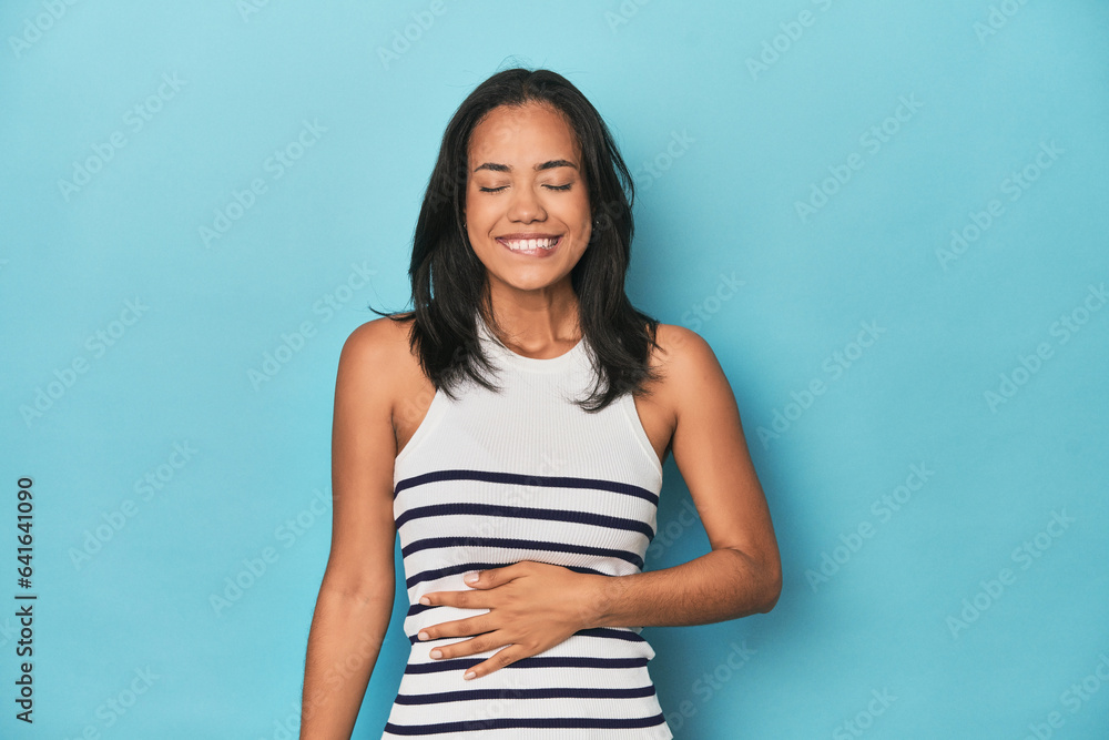 Filipina young woman on blue studio touches tummy, smiles gently, eating and satisfaction concept.