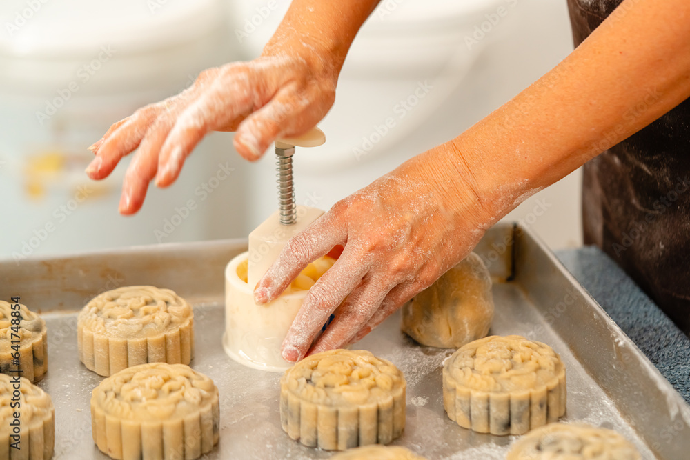 Mooncake making process. A mooncake is a Chinese bakery product traditionally eaten during the Mid-Autumn Festival.