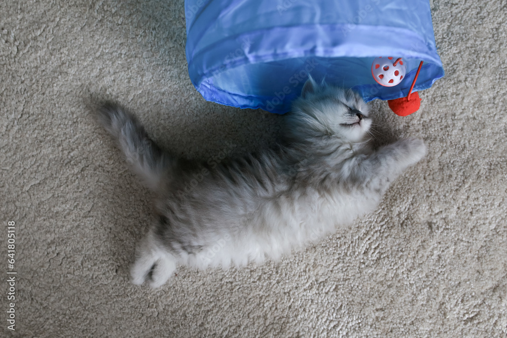 a small cute fluffy kitten of a british longhair cat lies on a light carpet in the living room, a pet in a modern interior, a tiny animal with big eyes