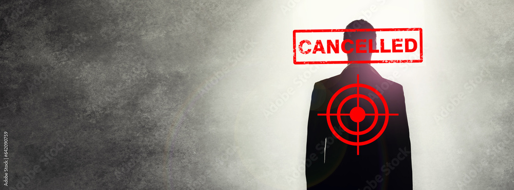Cancel culture, overlay and target on silhouette of man for bias, political controversy or criticism. Mockup space, banner and cancelled person with bullseye for problem, mistake and error in society
