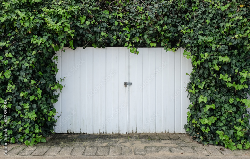 White wooden garage door in the wall covered with green ivy