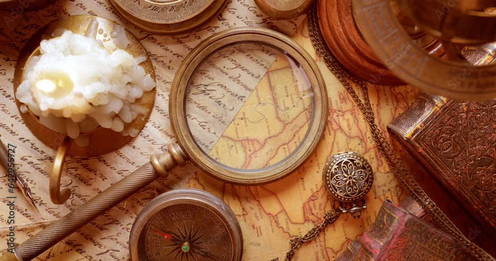 Vintage style travel and adventure. Vintage old compass and other vintage items on the table.