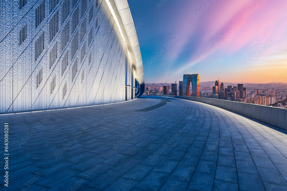 Empty floor and modern city skyline with building at sunset in Suzhou, Jiangsu Province, China. high angle view.
