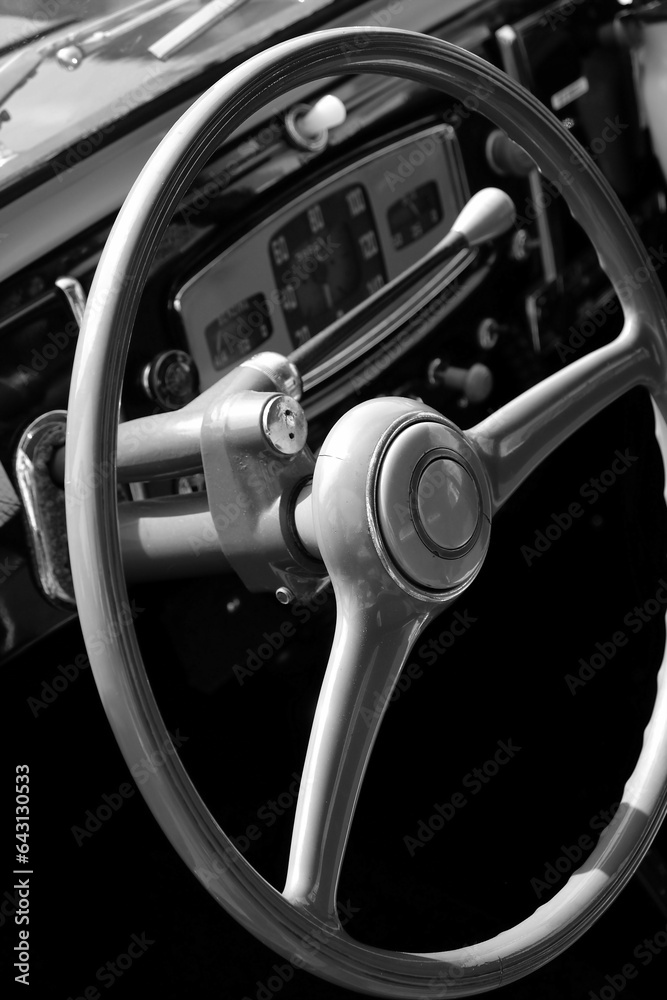 Lenkrad und Armaturenbrett mit Blumvase eines italienischen Oldtimer der Fünfzigerjahre am Lenkwerk in Bielefeld im Teutoburger Wald in Ostwestfalen-Lippe, fotografiert in klassischem Schwarzweiß