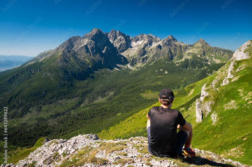 Embracing the beauty of the Belianske Tatras, a young traveler revels in serenity, all while the High Tatras' grandeur unfolds in the backdrop.