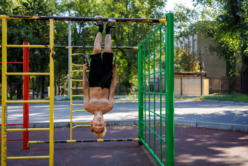 The boy hung upside down on the sports rings with his hands on them. Street workout on a horizontal bar in the school park.