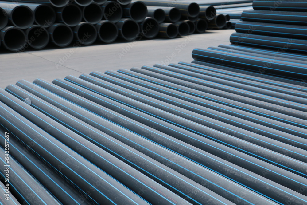 PE pipe plant, Industrial PE pipes with blue line for gas and water. HDPE pipe, Polyethylene PE100 pipe. Polyethylene pipe plant