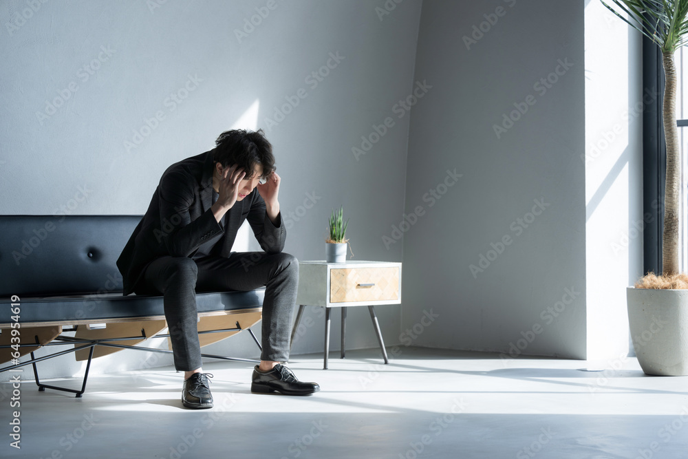 椅子に座って落ち込む男性 鬱や株式投資やFXや仮想通貨などの投資に失敗イメージ 広角