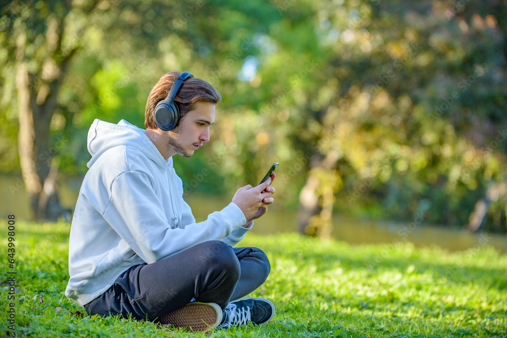 Portrait of young man in headsphone with a phone in his hands outdoors. Young guy looks at the screen of a cell phone while sitting on green lawn in the park. White man with smartphone outdoors