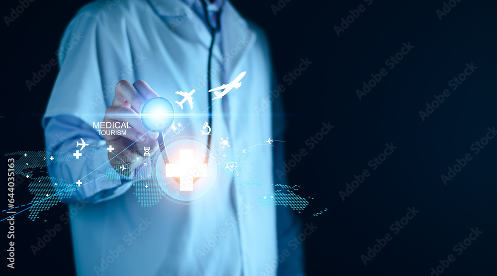 Medical tourism concept, Health tourism and international medical travel insurance. Medical Hub. Healthcare and medicine on global network. health tourism international, life insurance throughout trip