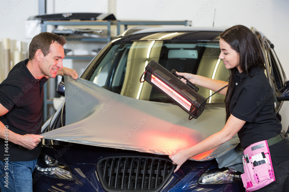 Car wrappers using red light lamp to flatten vinyl film