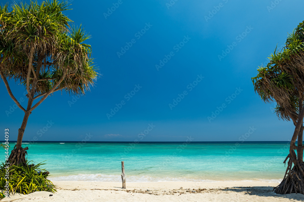 Tropical sandy beach with turquoise ocean water at Gili Trawangan, one of the Gili islands in Lombok, Indonesia