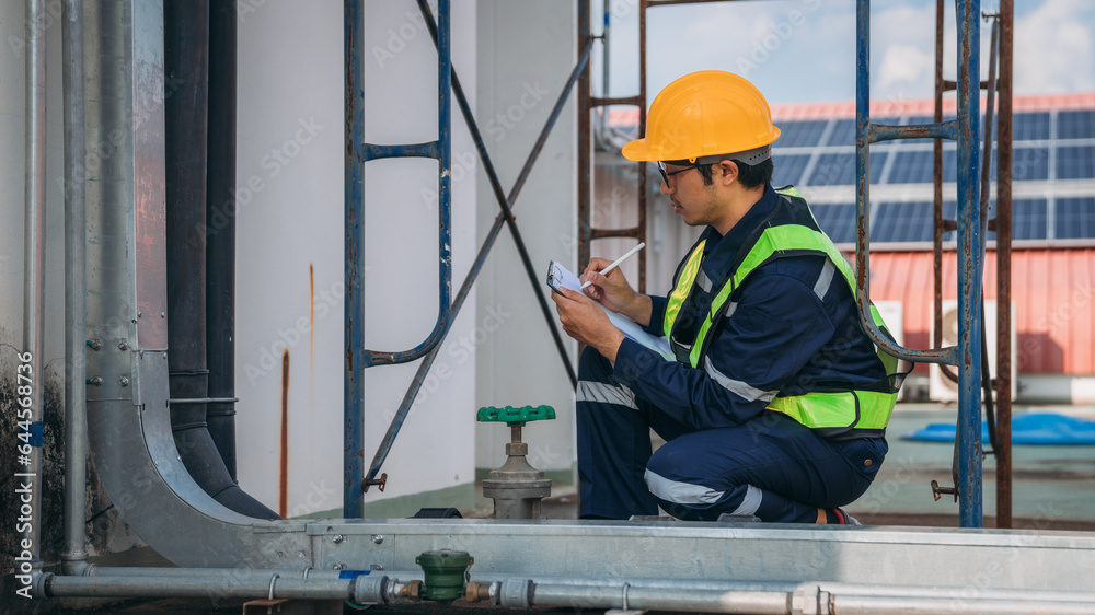 A team of engineers is checking the air conditioning cooling system of a major building or industrial facility.