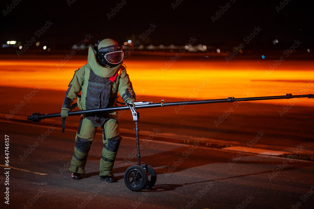 Bomb disposal officers wearing protective gear Investigating a suspected bomb outside the airport building. with remote robotic arm