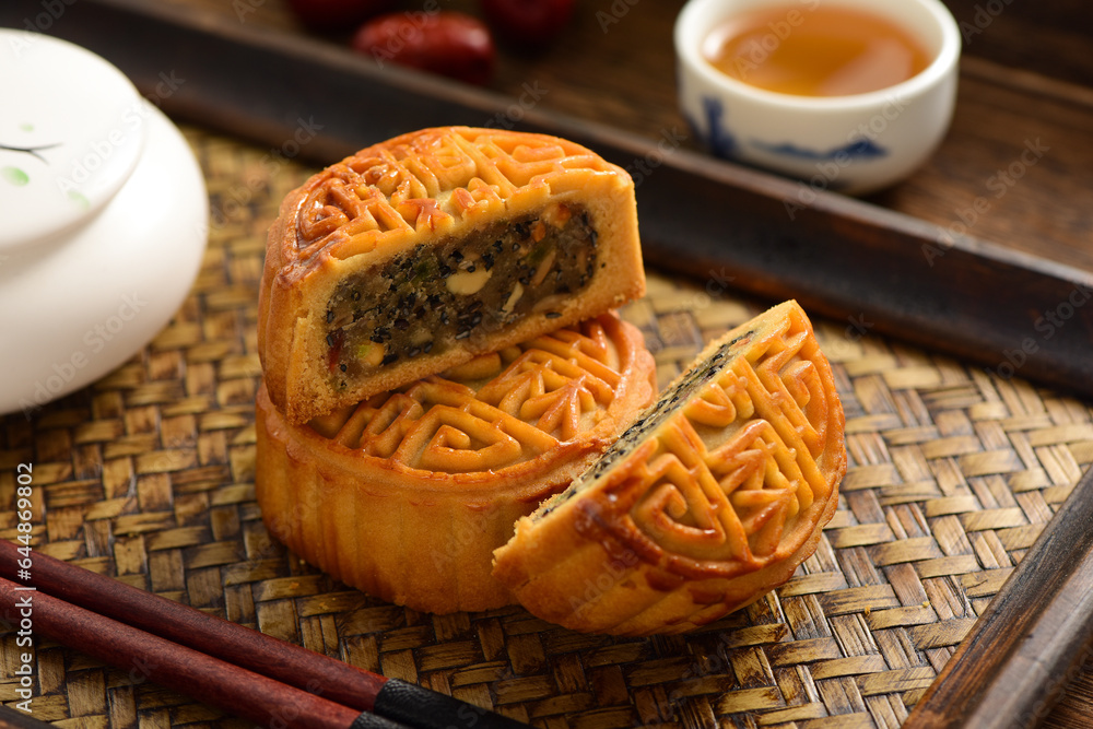 Mid-Autumn Festival mooncakes on a retro background. The Chinese meaning on the mooncakes in the picture is: black sesame, representing the taste of mooncakes