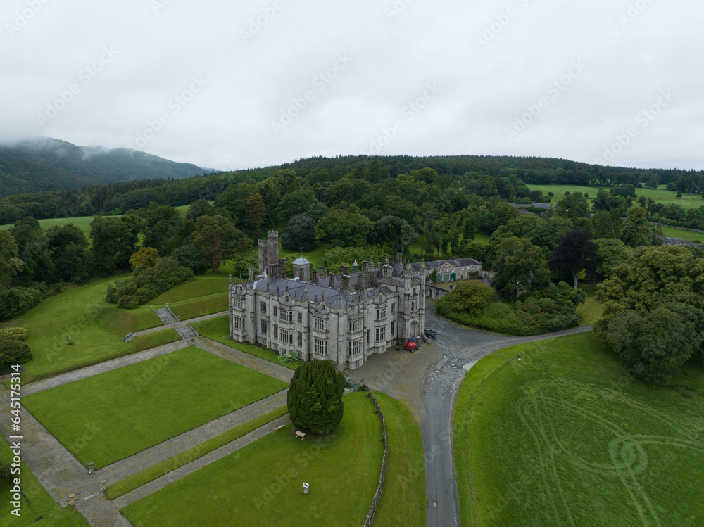 Aerial view of Narrow Water castle Elizabethan revival style mansion near the Northern Ireland - Ireland border