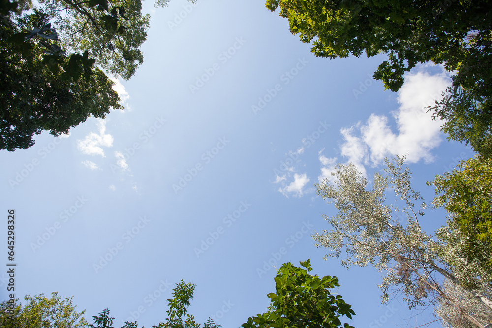 Textured background image of a blue sky with clouds and a frame of tree branches, for your creative design or illustrations.
