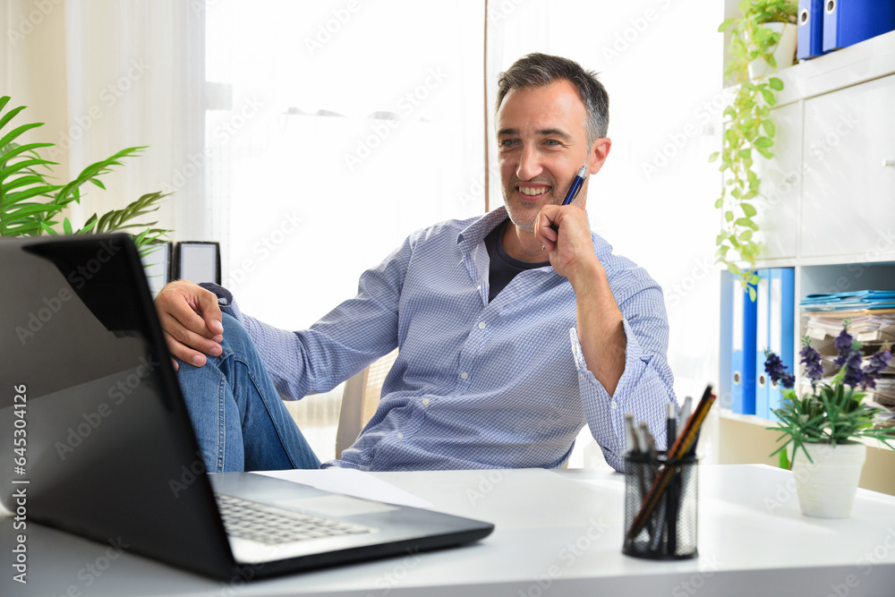 Entrepreneurial adult man sitting comfortably proudly at his desk