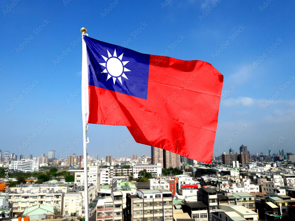 The flag of Taiwan flutters in the sky. 26th floor rooftop cityscape in Kaohsiung, Taiwan.