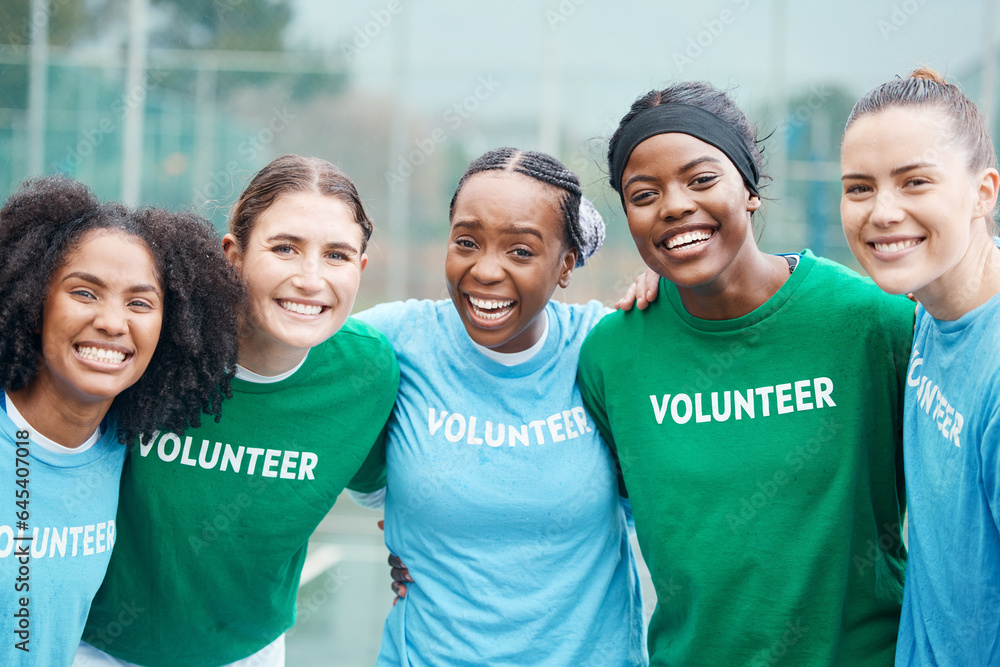 Happy women, portrait and volunteers in sports fitness, netball or outdoor exercise together for community. Group of athletic players smile and hug in team sport, motivation or volunteering on court