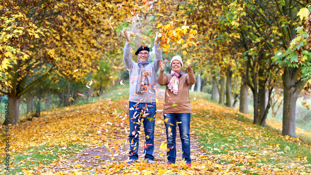 zwei lebensfrohe Senioren werfen Laub in die Luft