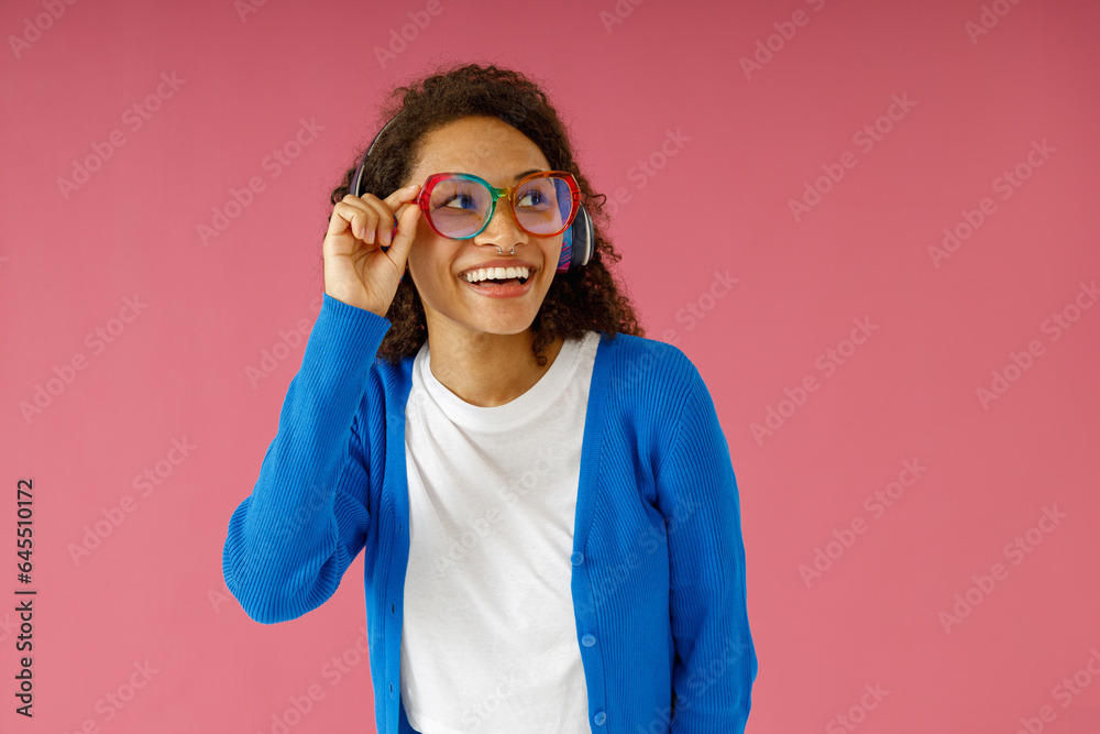 Joyful woman in headphones and glasses touching cheek and looking at side on pink studio background