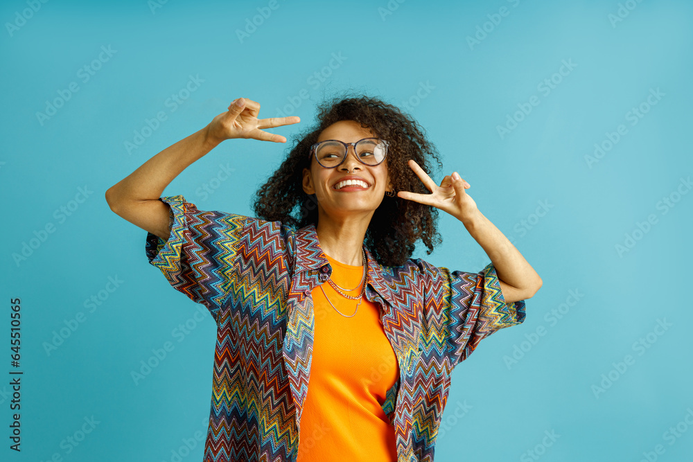 Woman in eyeglasses over blue background smiling with happy face doing victory sign with fingers